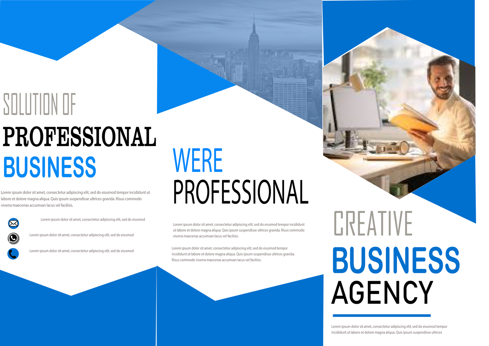 Blue and white geometric tri-fold business brochure template with city skyline and office imagery.
